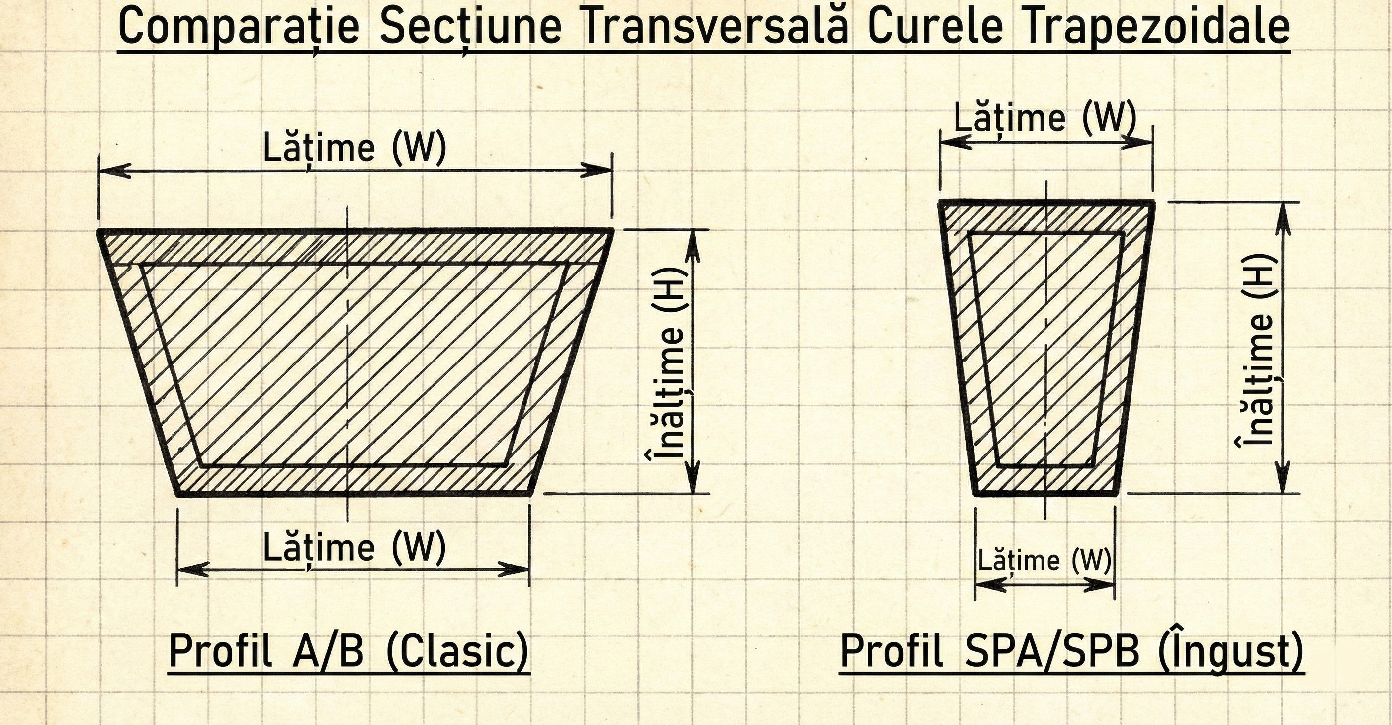 O confuzie frecventă în rândul clienților noștri este între profilurile clasice (Z, A, B, C) și cele înguste de înaltă performanță (SPZ, SPA, SPB, SPC). Deși la prima vedere par să aibă aceeași lățime la partea superioară, geometria lor este diferită, iar performanțele sunt incomparabile.